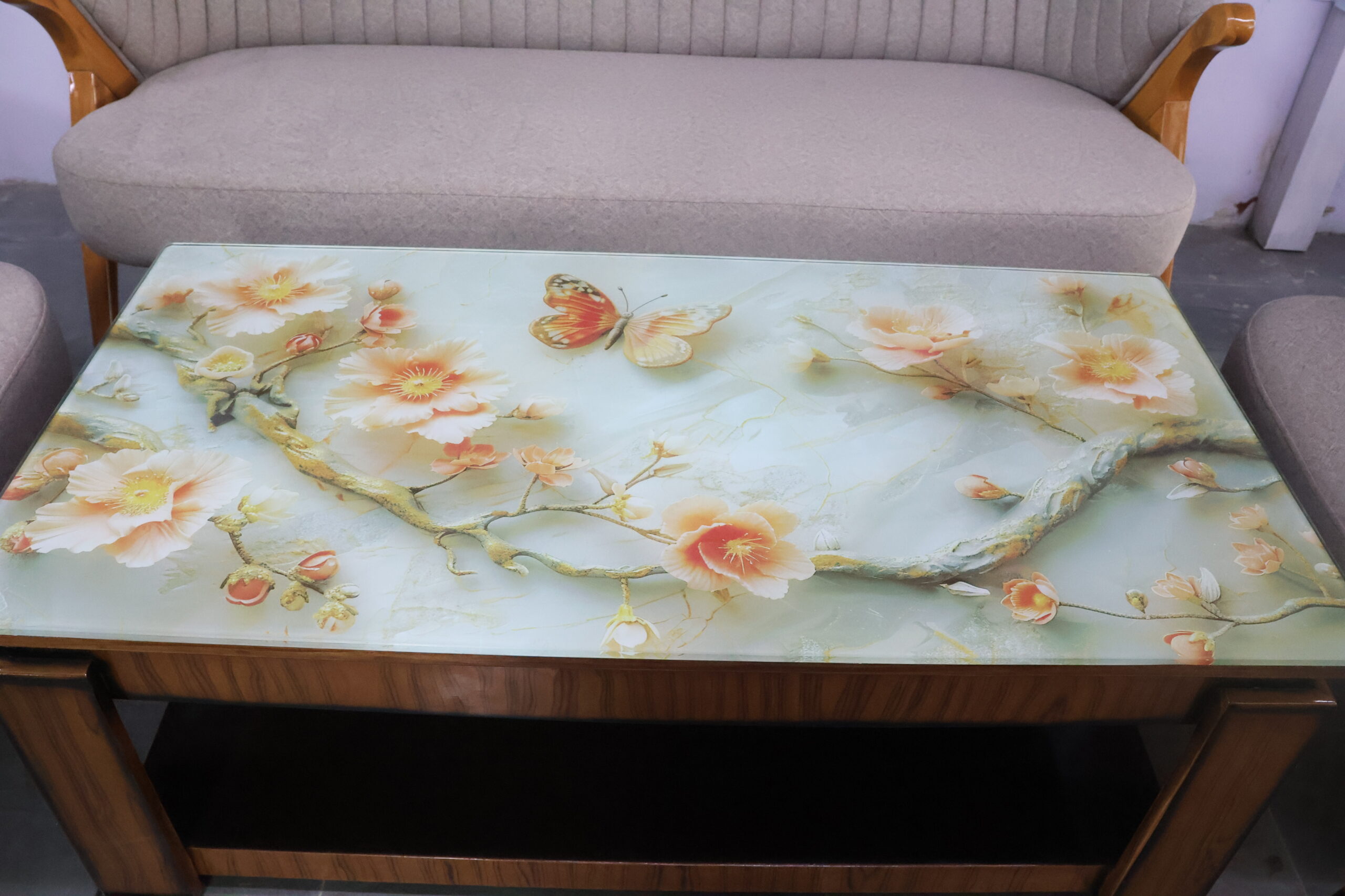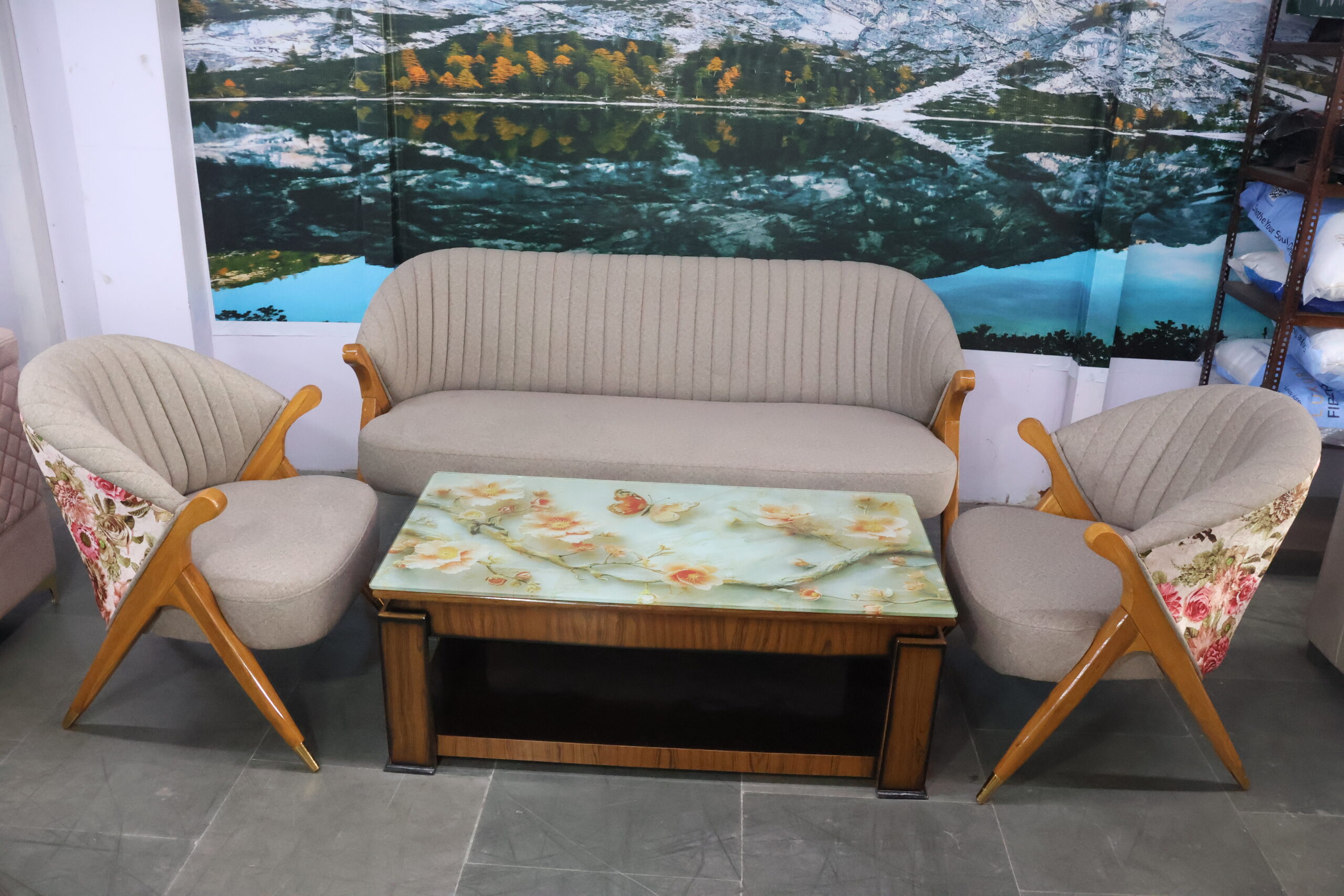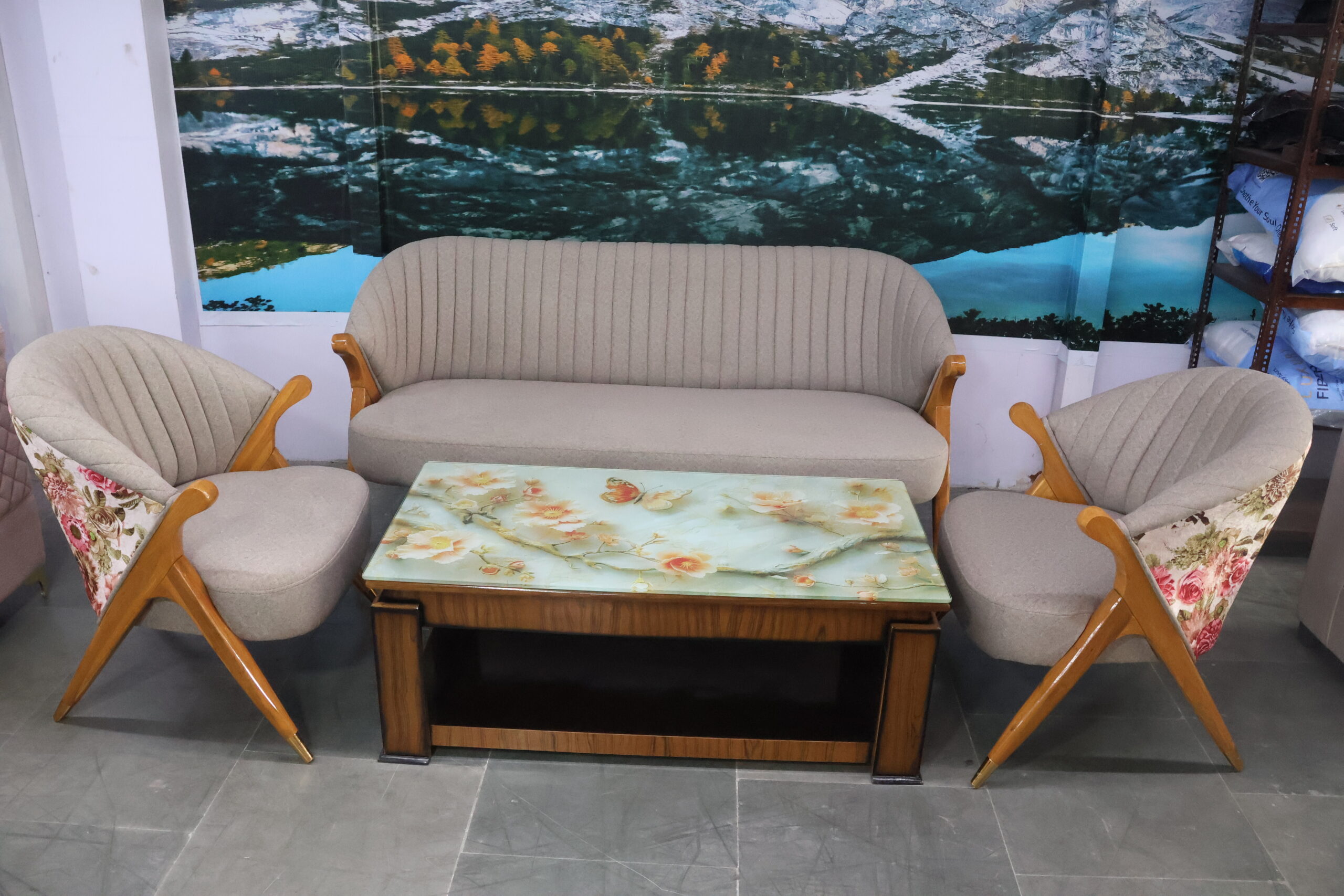The two single chairs come with stylish floral-patterned back panels, adding a unique artistic touch to the overall look. The center table features a stunning floral glass top, making it an eye-catching addition to your space.