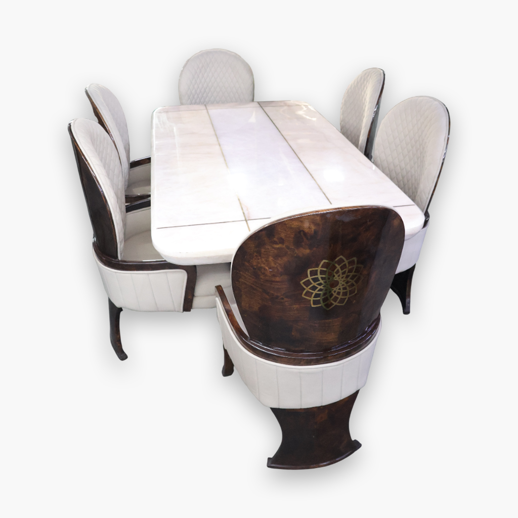 Upgrade your dining experience with this stunning Luxury 6-Seater Dining Table Set, crafted to bring elegance, comfort, and sophistication to your home. The high-quality marble-finish tabletop adds a premium touch, while the beautifully designed chairs enhance the overall aesthetic.