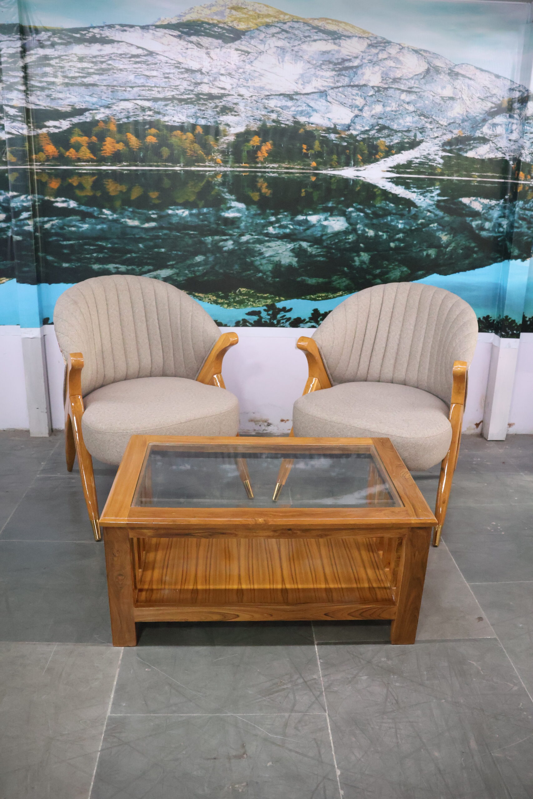 This set features two modern lounge chairs with a rounded backrest and vertical-stitched upholstery, offering exceptional comfort and a soft, luxurious feel. The smoothly polished wooden arms and legs enhance its premium look while ensuring durability.