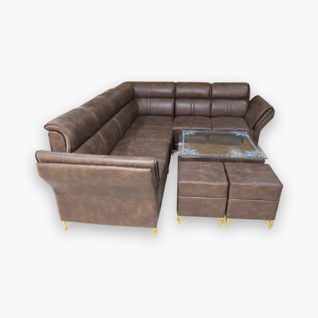 Premium Brown L-Shape Sofa Set with Center Table & Ottomans